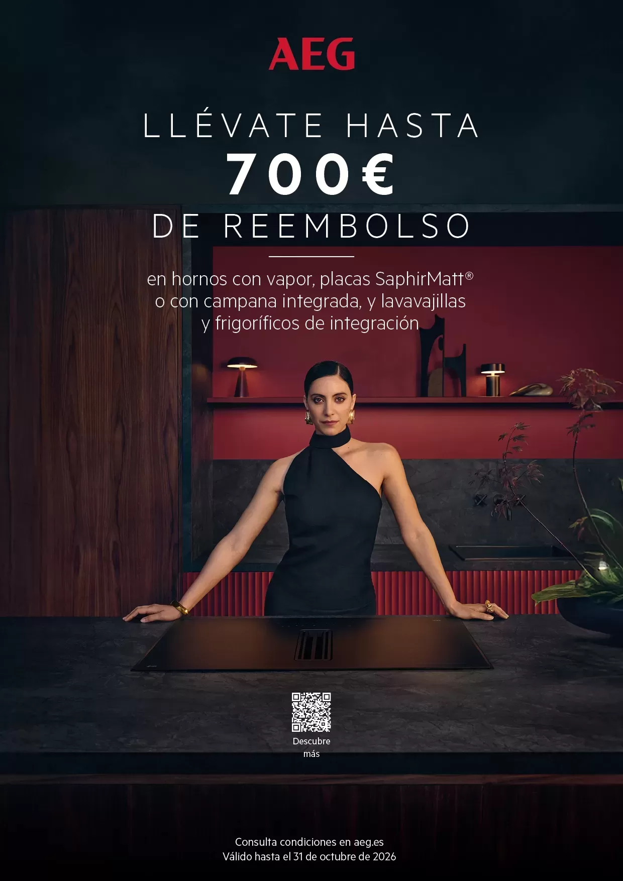 Consigue hasta 700 € de reembolso por la compra del 1/03/26 al 31/10/26 de hornos con vapor, placas SaphirMatt® o con campana integrada, y lavavajillas y frigoríficos de integración AEG